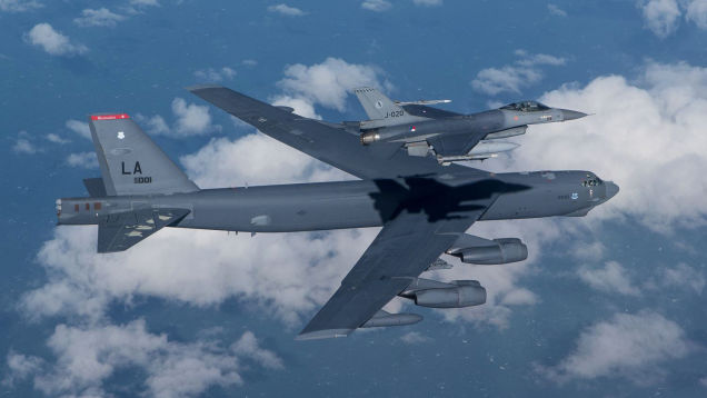 One of Europe’s top aviation photographers, Frank Crebas, was along for the ride in a F-16BM as Dutch F-16s intercepted a pair of B-52H Stratofortresses during Exercise Polar Growl. The result was this amazing image of an F-16 over a B-52 with its shadow perfectly aligned on the big bomber’s spine.
