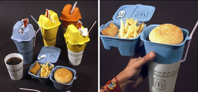 Posted over the weekend to the McDonald’s New Zealand Facebook page with the caption “McGenius?” the interlocking containers would put a sandwich on top of a beverage cup, covered by a fry bin that would have indentations on the top where you could store condiments.