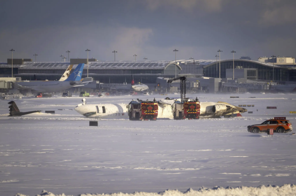 A Delta Air Lines jet attempting to land at Toronto Pearson Airport amid strong winds and drifting snow crashed and flipped over on the tarmac on Monday afternoon, finally coming to a rest with its belly up and with at least one wing shorn off.